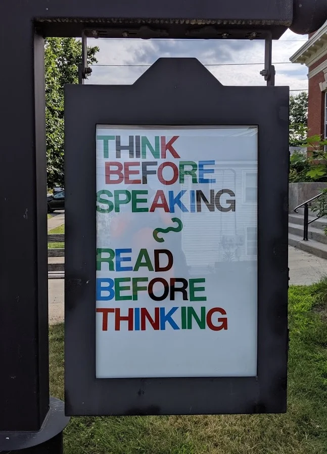 Our last library of the day was the Simon Fairfield Public Library in Douglas. It’s a little old library from 1903. It's small, but sweet and interesting. We loved the spirit of the signs in the front lawn: “Think Before Speaking, Read Before Thinking.” Excellent advice. Inside, the space is jam-packed with books and materials. We arrived late in the day, but there were still patrons on hand. The staff was friendly and willing to chat with us about the library and its history. One of the more interesting items is a campaign banner for William Harrison - America’s 9th and shortest-serving president. (Harrison died on April 4, 1841, just a month after his inauguration on March 4th of the same year.) What is curious about the banner is that it says it’s from Douglass, but it’s from Douglass, Texas and has nothing to do with Douglas, Massachusetts. Library Land Score: 3.91.